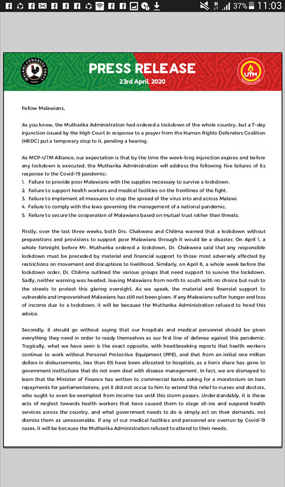According to the two parties, President Professor Arthur Peter Mutharika’s administration is pushing for lockdown before addressing the concerns of Malawians.