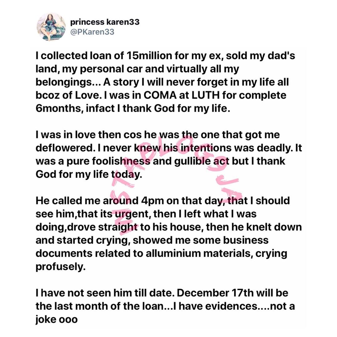“I collected loan of 15million for my ex, sold my dad’s land, my personal car and virtually all my belongings…A story I will never forget in my life all bcoz of love. I was in COMA at LUTH for complete 6 months, infact I thank God for my life.