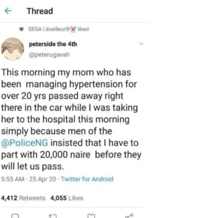 Rugavah posted on Monday, April 25, 2020, both on Twitter and Facebook a long thread that his mother died at police checkpoint while he was trying to get her to the hospital.