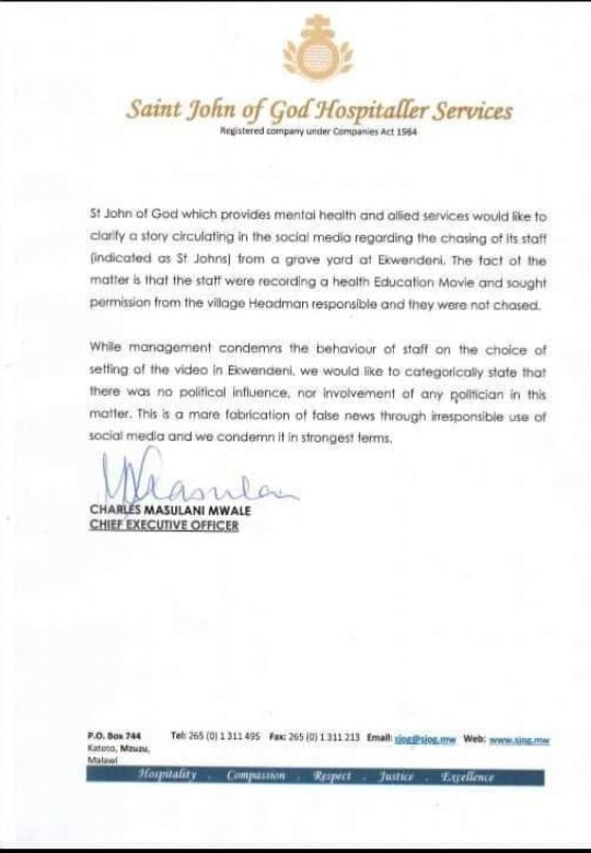 “St John of God which provides mental health and allied services would like to clarify a story circulating in the social media regarding the chasing of its staff (indicated as St Johns) from a grave yard of Ekwendeni.