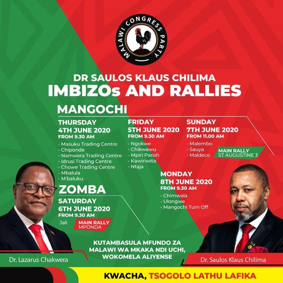 According to the programme seen by this publication, Chilima will start the tour of Mangochi, a stronghold of the United Democratic Front (UDF) with a stopover at Masuku Trading Centre from 9:30am.