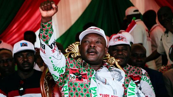 In this Thursday June 24, 2010 photo Pierre Nkurunziza, current president of Burundi and of the ruling CNDD–FDD Party, gestures to supporters during his election campaign at Gatumba , 20km outside of the capital of Burundi, Bujumbura.