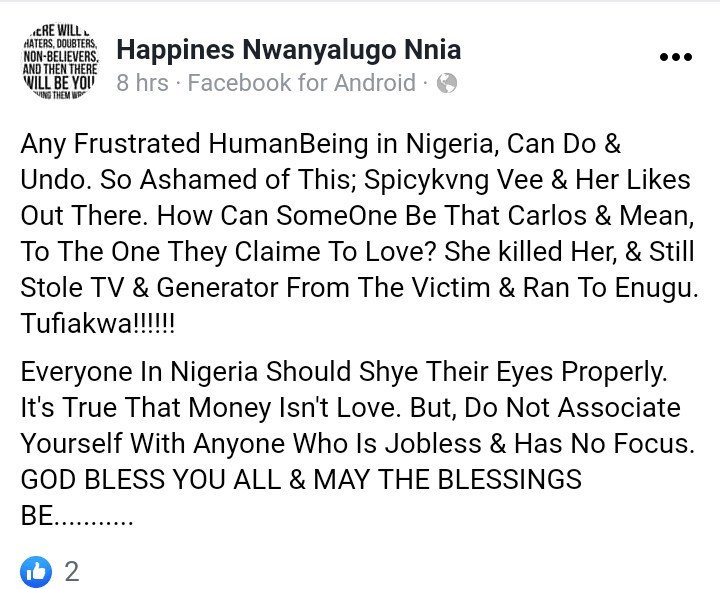 The deceased, identified as Vivian, allegedly caught her lesbian partner Spicykvng Vee having sex with a man.