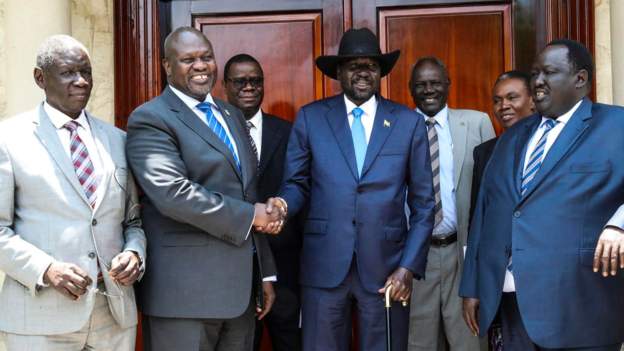 President Kiir and Mr Machar met at State House in the capital, Juba, and struck a deal.