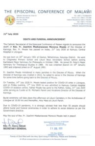 “On Tuesday, 14 July 2020, Father Mwale tested positive for COVID-19 while in Lilongwe, and on Friday evening, 17 July 2020 he was admitted at Kamuzu Central Hospital COVID-19 isolation centre. Father Mwale has gone to the Lord today 21, July 2020 while serving as Curate at St Michaels Parish and Vocational Director of the Diocese of Karonga,” reads in part the statement.