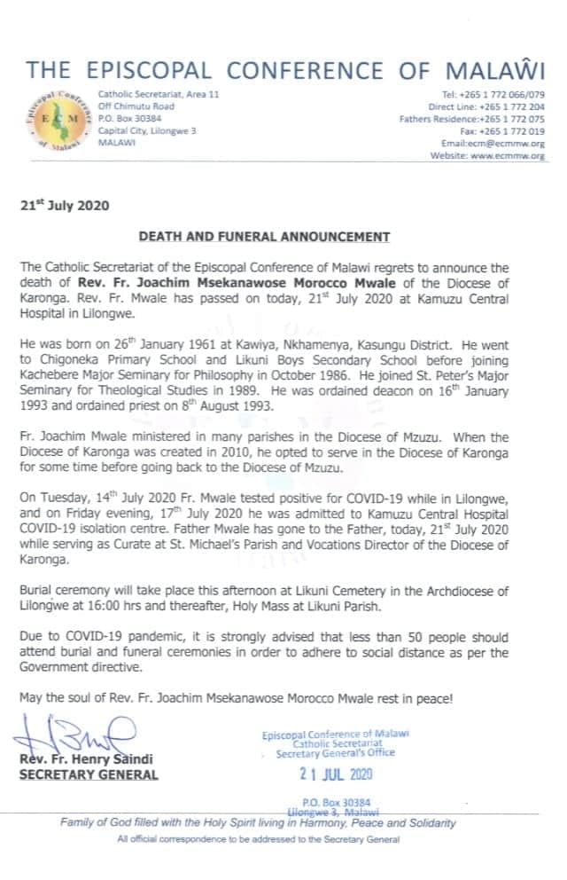 “On Tuesday, 14 July 2020, Father Mwale tested positive for COVID-19 while in Lilongwe, and on Friday evening, 17 July 2020 he was admitted at Kamuzu Central Hospital COVID-19 isolation centre. Father Mwale has gone to the Lord today 21, July 2020 while serving as Curate at St Michaels Parish and Vocational Director of the Diocese of Karonga,” reads in part the statement.
