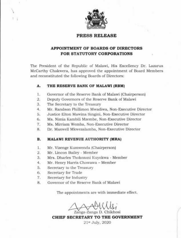 Reports reaching this publication shows that President Dr. Lazarus Chakwera has appointed Board Directors for the Reserve Bank of Malawi(RBM) and Malawi Revenue Authority (MRA)