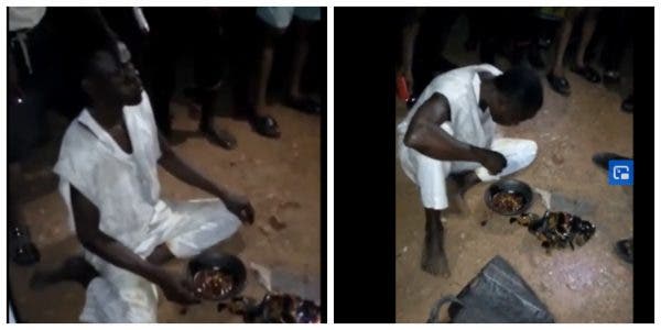 An unidentified man, believed to be an Islamic cleric was caught trying to drop a fetish sacrifice in a community has been forced to eat the sacrifice himself.