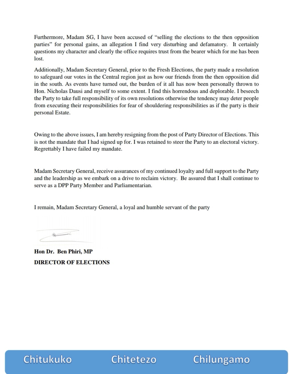 “Owing to the above issues, I am hereby resigning from my post of Party Director of Elections. This is not the mandate that I have signed up for. I was retained to steer the party to an electoral victory. Regrettably I have failed my mandate,” said Phiri.