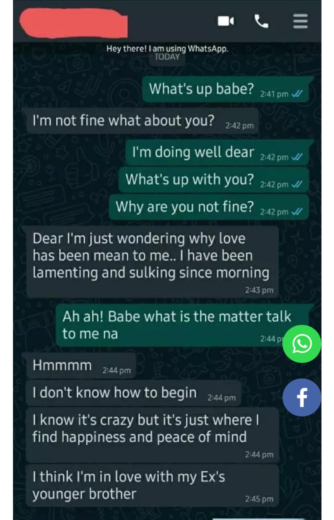 In a chat between her and her best friend, she expressed that she’s madly in love with her ex lover’s younger brother and she has no idea on what to do.