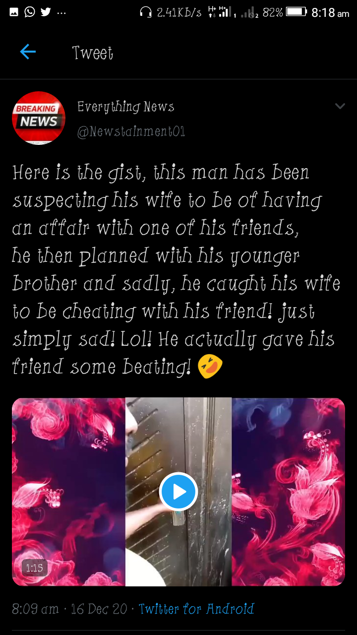 “Here is the gist, this man has been suspecting his wife to be of having an affair with one of his friends, he then planned with his younger brother and sadly, he caught his wife to be cheating with his friend! just simply sad! Lol! He actually gave his friend some beating!”…