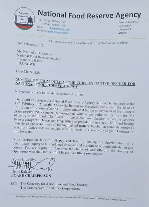 Chief executive officer for the National Food Reserve Agency (NFRA) Nasinuku Saukira alongside the director of finance Peter Salamba have been suspended over the utilization of K611 million intended for procurement of maize without the authority of the line ministry or the board.