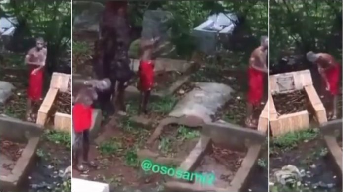 A shocking video has emerged online of three young men suspected to be “Sakawa boys bathing at a cemetery while tying red clothing around their waists.