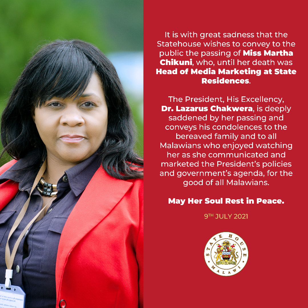 President Dr. Lazarus Chakwera has expressed shock over the untimely death of State House press officer responsible for Marketing and Special Events Martha Chikuni.