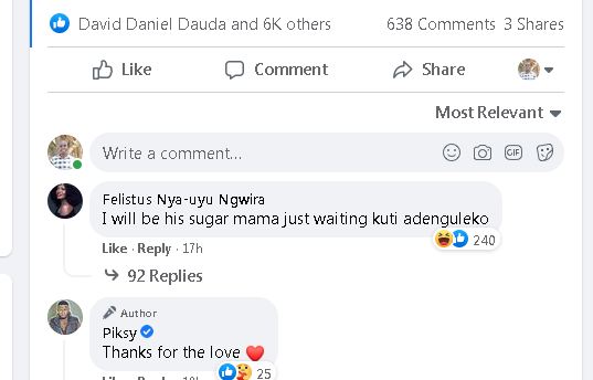 Just after posting it, Nya-uyu Ngwira jokingly reacted by saying: “I will be his sugar mama just waiting kuti adenguleko.”