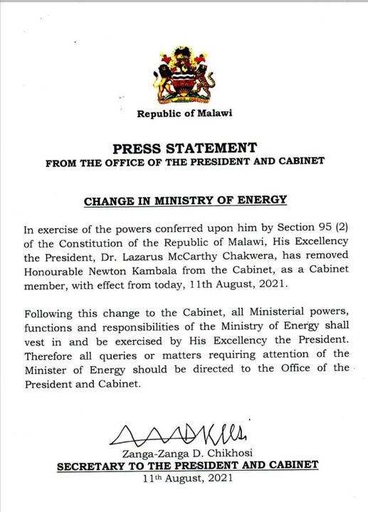 Reports reaching this publication indicates that President Lazarus Chakwera has fired Newton Kambala who until today was the country’s Minister of Energy.