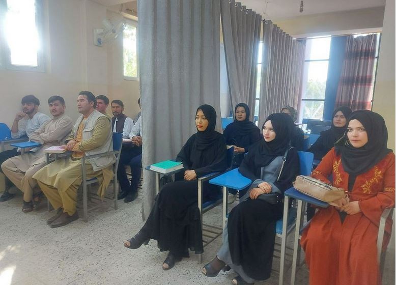 Photographs shared by Avicenna University in Kabul, and widely circulated on social media, show a grey curtain running down the centre of the classroom, with female students wearing long robes and head coverings but their faces visible.