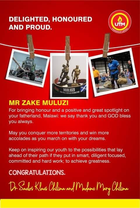 State Vice President Dr. Saulos Chilima who is also President of the United Transformation Movement (UTM) has saluted Zake Muluzi, son to former President Dr. Bakili Muluzi for the emerging victorious in the John O’Groats Strongest Man competition.
