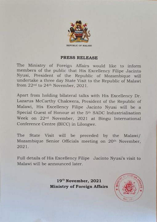 According to statement released by the Ministry of Foreign Affairs, the Mozambique president Filipe Jacinto Nyusi will undertake three day state visit to Malawi from 22nd November to 24th November, 2021.