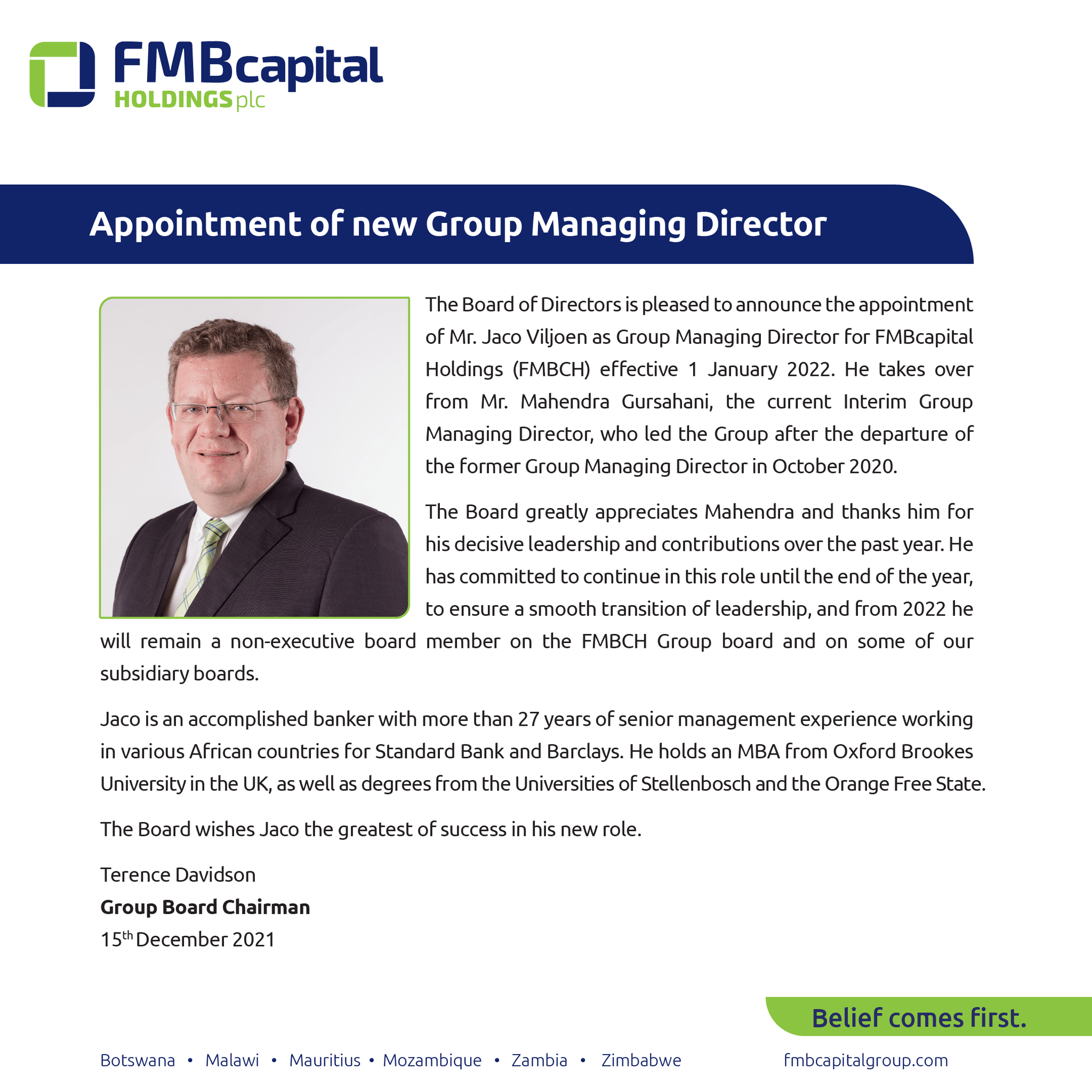 Information reaching this publication indicates that Jaco Viljoen has been appointed as FMB Capital Holdings Managing Director with effect from January 2022.
