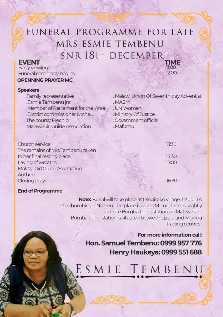 The body of retired child justice magistrate Esmie Tembenu will be laid to rest today at her home village Dingisako, Lizulu, Traditional Authority Chakhumbira.