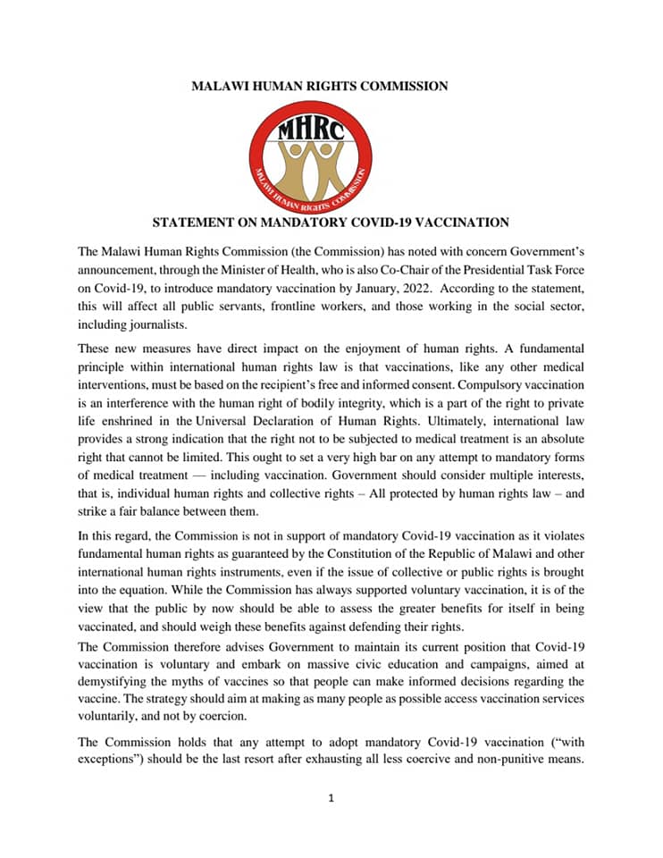 The Malawi Human Rights Commission (MHRC) has spoken against government’s proposal to introduce mandatory COVID-19 vaccination to ensure increased uptake.