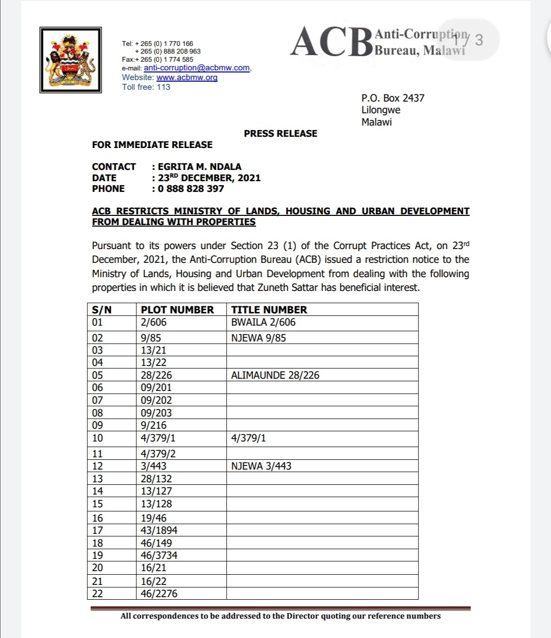 ACB Public Relations Officer Egrita Ndala has confirmed of the development in a statement made available to faceofmalawi.