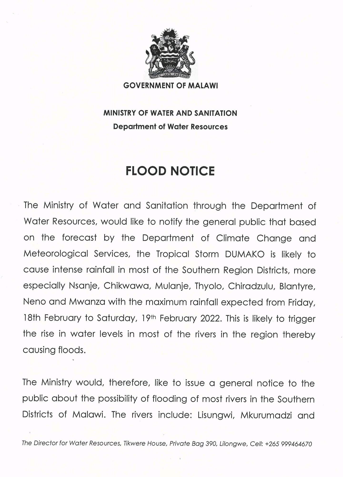 The Tonse Alliance government through Ministry of Water and Sanitation has warned of a second wave of flash floods in the southern part of the country following tropical cyclone ‘Dumako’ which is expected to hit the country from Friday.