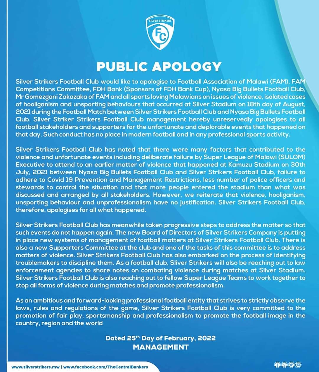 Silver Strikers Football Club has issued an apology to Football Association of Malawi (FAM), FDH Bank, Nyasa Big Bullets Football Club and FAM competitions and communications director Gomezgani Zakazaka following incidents of hooliganism that occurred on August 18 at Silver Stadium in Area 47, Lilongwe.