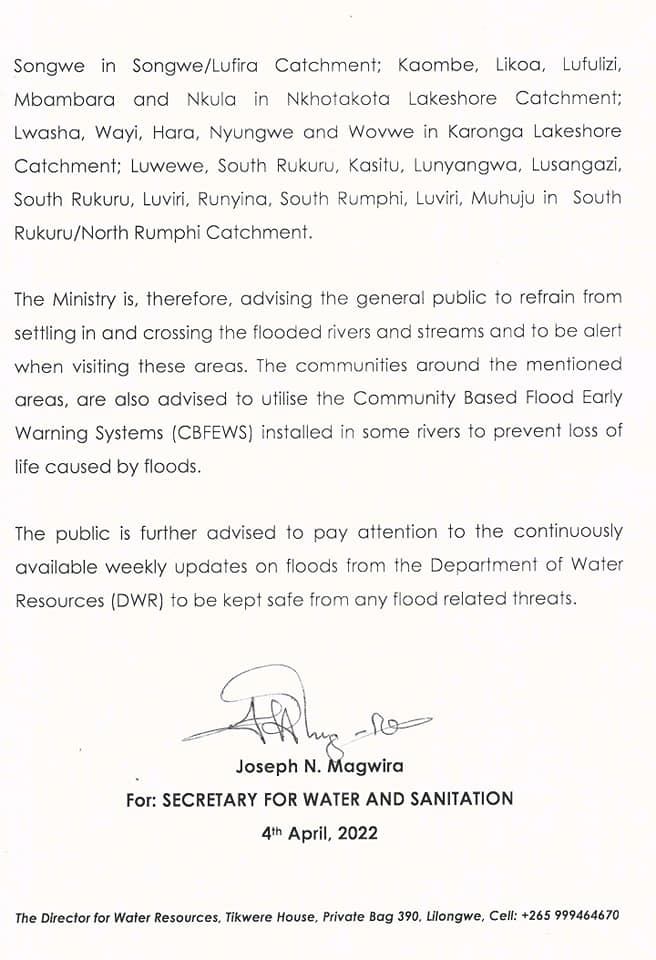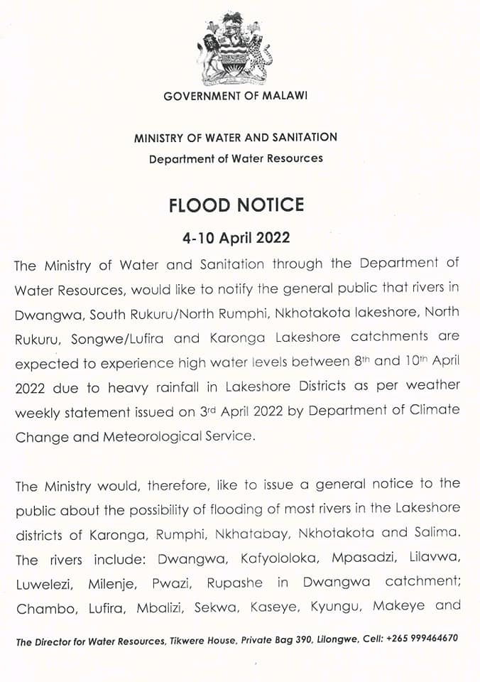 The government of Malawi through the Department of Water Resources has warned of impending heavy floods from April 4 to April 10, 2022 in five districts namely; Nkhotakota, Salima, Nkhata-Bay, Rumphi and Karonga.