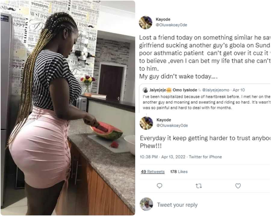 According to Olukayode, his friend walked in on his girlfriend giving another guy a job. The deceased who was an asthmatic patient was so shocked that he passed away a few days after.