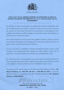 Minister of Trade Mark Katsonga Phiri has issued “final warning” to cooking oil suppliers and retailers who have not reduced prices following the removal of 16.5 % Value Added Tax (VAT).