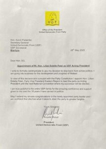 In a signed statement, Muluzi has since appointed Lilian Patel as acting president until a party convention is held.