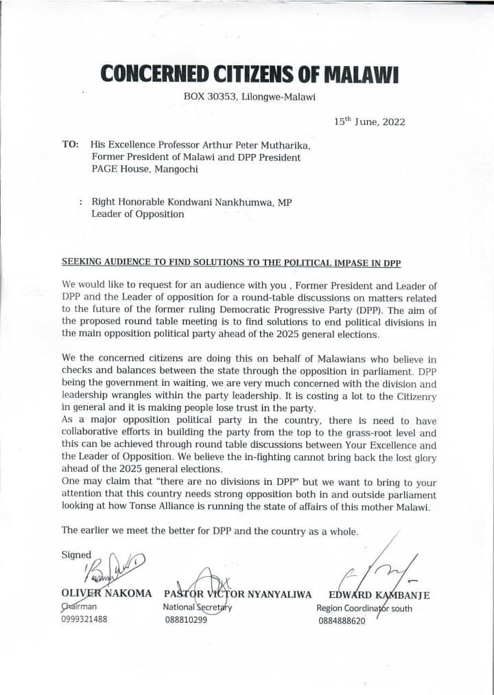 “We would like to request for an audience with you, Former President Peter Mutharika and Leader of DPP and the Leader of Opposition for a round-table discusions on matters related to the future of the party. The aim of the proposed round-table meeting is to find solutions to end political divisions in the main opposition political party ahead of 2025 general elections,” reads in part the letter.