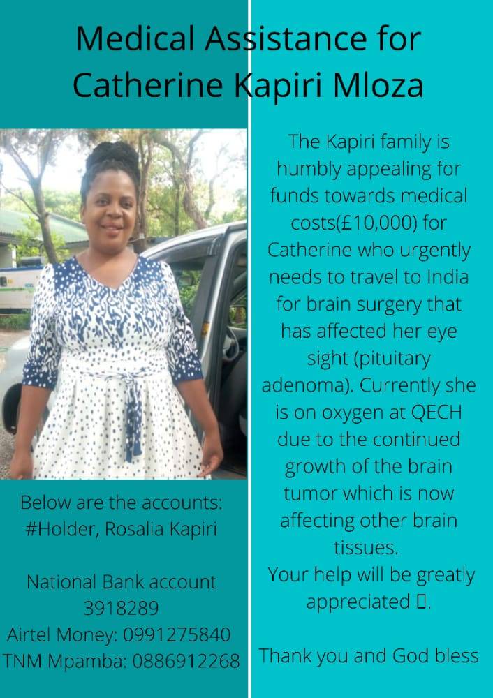 The family of Catherine Kapiri Mloza in Lilongwe is in dare need of 12000.00 GBP (MWK15,000,000.00 approximately) to help Catherine travel to India for medical treatment as recommended by medical doctors.