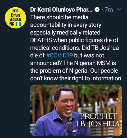 A few hours ago, a popular Nigerian journalist and social media influencer, Dr. Kemi Olunloyo, took to her social media and cautioned the media over their poor information regarding the death of a prominent Nigerian pastor, TB Joshua.