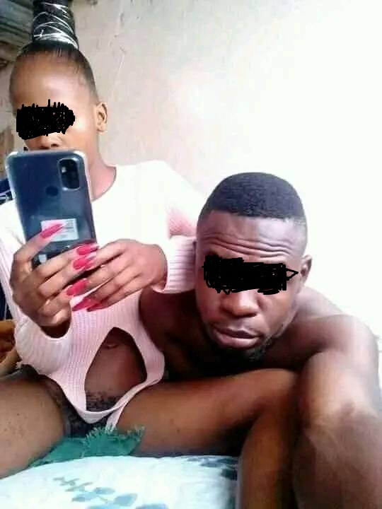 In the photo, the slay queen while holding a phone pauses half naked with a man suspected to be her boyfriend.