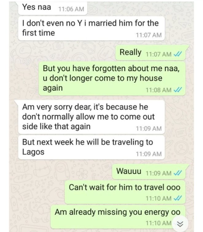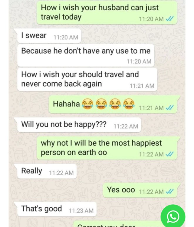 She told her side boo that her husband is travelling and she would come over to his place to grace his bed. She also wished that her husband never returns again.