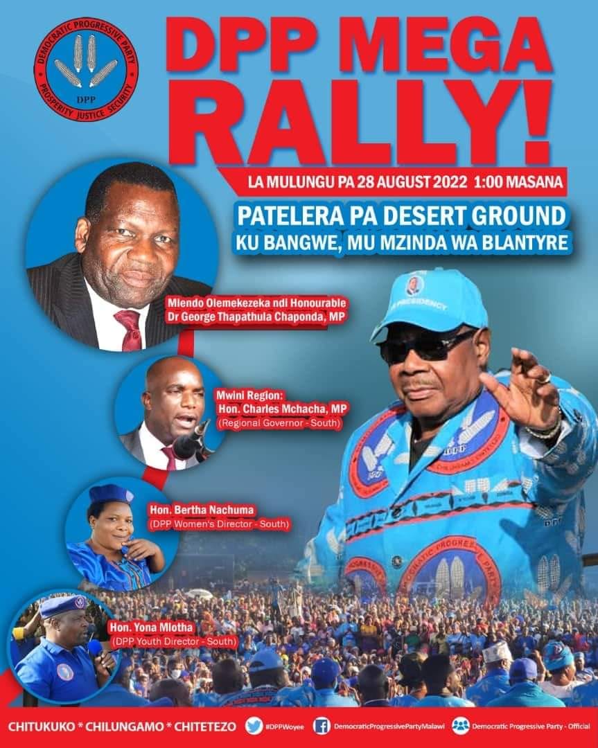 The opposition Democratic Progressive Party (DPP) camp of former President Peter Mutharika will on August 28, 2022 hold a mega rally at Desert Ground in Bangwe Township in Blantyre.