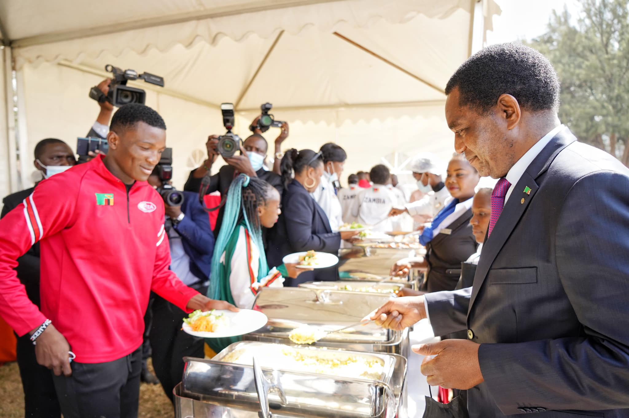 President Hakainde Hichilema is trending on social media after sharing photos showing him serving food to Zambia Women Football Team.