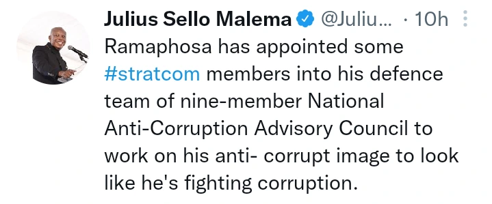 “Ramaphosa has appointed some #stratcom members into his defence team of nine-member National Anti-Corruption Advisory Council to work on his anti- corrupt image to look like he’s fighting corruption.” – Said Julius Malema.
