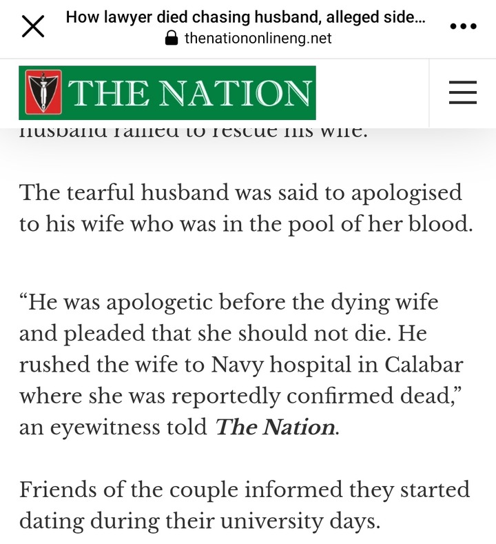 Eyewitness accounts revealed that the man saw what had happened, parked his car, and ran down to the spot of the accident. He was reportedly tearful and he apologized to her while she was lying in the pool of her own blood. It was then said that the man rushed her to the Navy hospital in Calabar where she was reportedly confirmed dead.The Nation also revealed that some of Claret’s friends said she had been dating her husband Sunday since they were in the University.