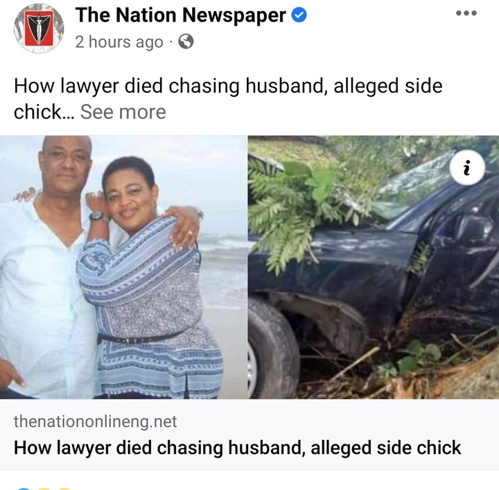 The news about the death of Lawyer, Claret Opara Bassey made headlines after it was revealed that she died while chasing her husband and his side chick in a car. According to The Nation, Claret was called by a friend and informed that her husband was spotted with another lady in a shopping mall. This got claret angry, and she immediately took one of her cars and headed to the mall.