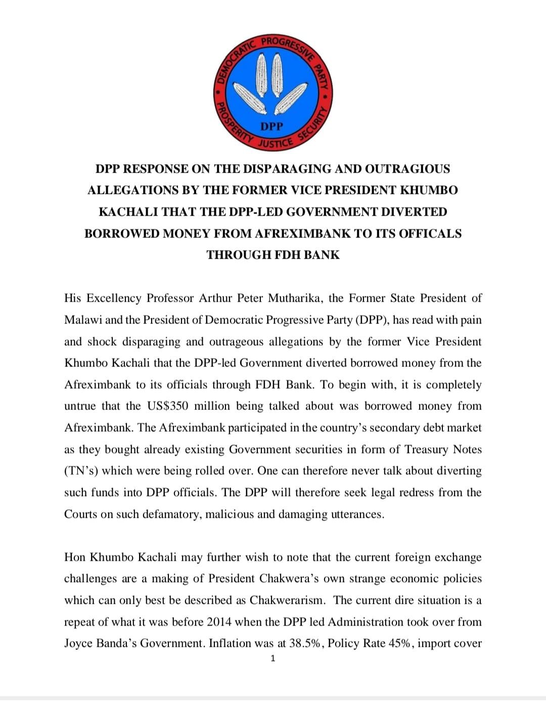 Kachali through his facebook page reportedly alleged that Mutharika’s government borrowed $350 million from the Afreximbank which he diverted it into DPP officials through FDH Bank.