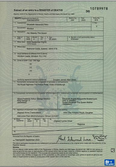 Queen Elizabeth II Cause of Her Death revealed (see her death certificate)