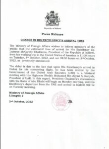 According to the Ministry, Chakwera is currently in Dubai for bilateral talks with President of United Arable Emirates.