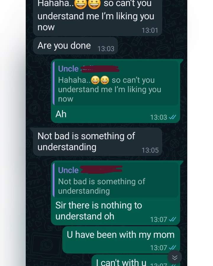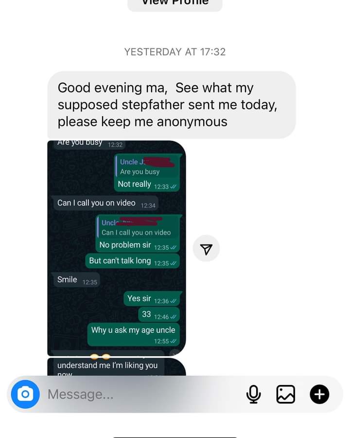 Apparently, the 33-year-old lady had fallen under the rather of her stepfather who revealed to her in a WhatsApp chat that he’s begining to like her.