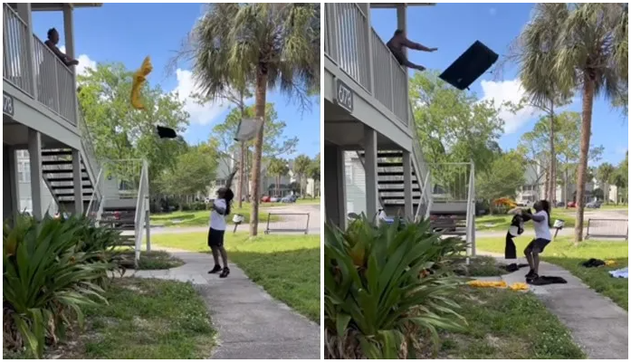She was filmed flinging his clothes down to him from a balcony while he tried to tried to stand up for himself.
