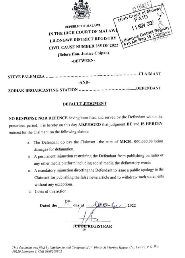 Due to the gravity of the claims, Pemeleza dragged to court the station demanding Mk20 million as compensation, retraction of the story and public apology.