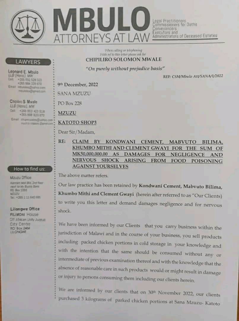 Four people have sued Sana Supermarket based at Katoto in Mzuzu demanding K50 million compensation for allegedly selling them rotten chicken portions on November 30, 2022.